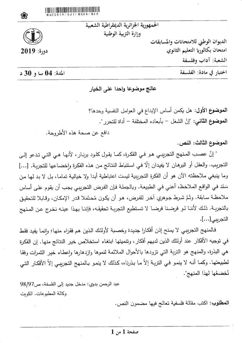 موضوع الفلسفة بكالوريا 2019 آداب و فلسفة Bac 2019