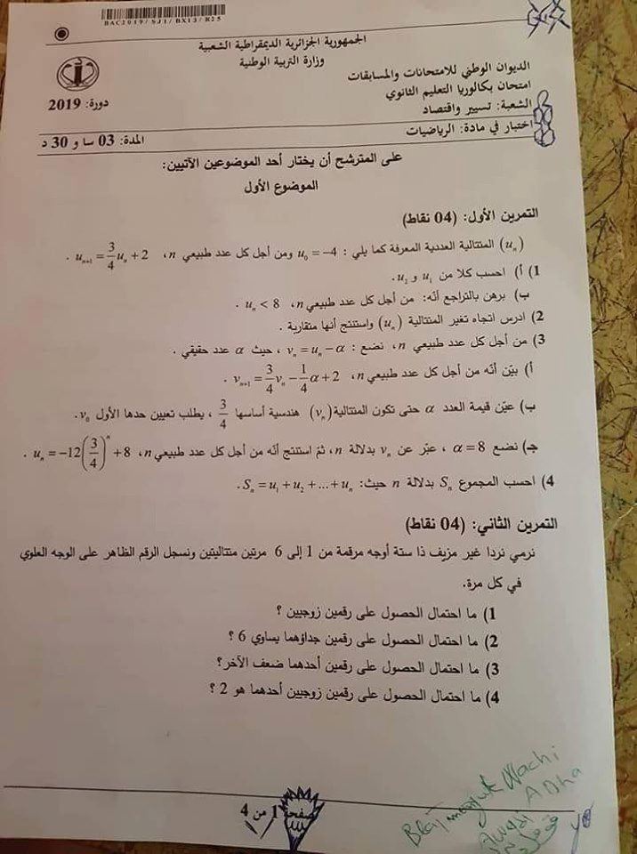 موضوع الرياضيات بكالوريا 2019 في الجزائر