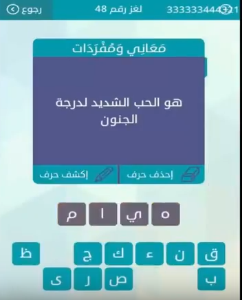 اجابة سؤال هو الحب الشديد لدرجة الجنون لغز رقم 48 من لعبة وصلة فى المجموعة السادسة صقور الإبدآع